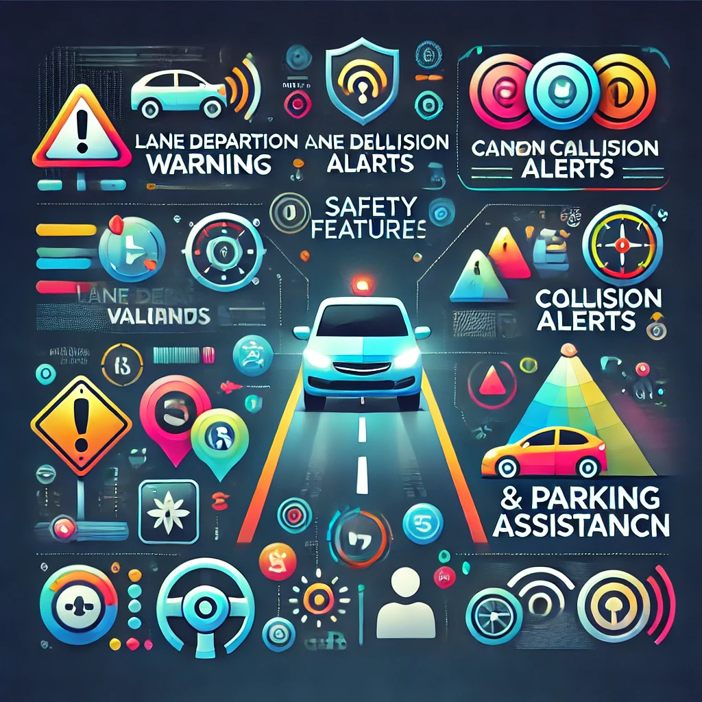 DALL·E 2024-11-26 12.34.48 – An infographic-style image showing the safety features of a car navigation system, including lane departure warnings, collision alerts, and parking as